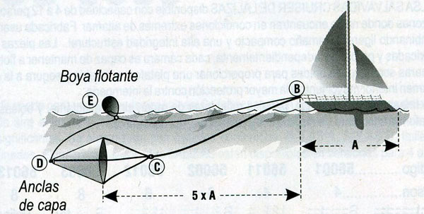Para hacer visible que está usando un ancla de capa y evitar que el cabo sea arrollado por otras embarcaciones puede conectar una boya flotante al cabo usado para retirar el ancla (E).
