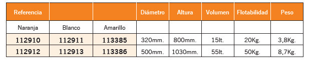 Boya tipo pera fabricada en polietileno soplado. Ø 25 cm. Altura 39 cm. Volumen 10 l. Flotabilidad 9,5 kg. Color naranja. Fabricación europea . También disponible en: ref. 112933 color blanco ref .112923 color amarillo