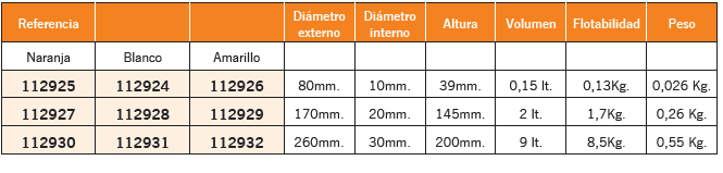 Flotador para redes. Fabricada de politileno soplado .Dimensiones: Diámetro exterior 8 cm. Diámetro interior 1 cm. Color naranja. Fabricación Europea .