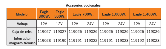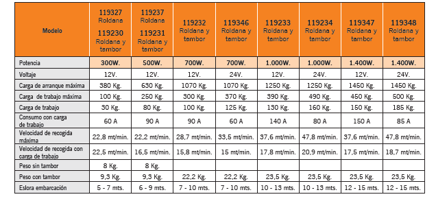 Molinetes eléctricos para maniobras de anclas horizontal en aluminio anodizado. Eje de acero inoxidable AIS I316, roldana en bronce cromado. Todos los modelos se suministran con la caja de relés y panel interruptor de subida/bajada y maneta. . Están provistos de una protección IP 67 que asegura la estanqueidad del motor. Recomendado para embarcaciones de 5-7 m • Potencias: 300, 500, 700, 1000 y 1.400W. Voltaje: 12 y 24V. • Disponible con y sin tambor para cabo. • Equipado con iman y sensor para la instalación del cuentametros de cadena. • Sistema manual de caida libre de la cadena. • El modelo de 300 y 500W. soporta únicamente cadena de 6mm. DIN766. Los modelos de 700, 1000 y 1400W. soportan cadena de 6 y 8mm.DIN766. • El modelo de 700W. se suministra con roldana para cadena de 6mm. y los modelos de 1.000 y 1.400W. con roldana para cadena de 8mm. • Si desea una medida diferente de la que se suministra de serie indiquelo al realizar el pedido.