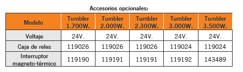 • Potencia: 1700, 2000, 2300, 3000 y 3500W. Voltaje: 24V. • Molinete de maniobras. • Base y tambor de acero inoxidable AISI316. • Motor estanco IP67 (1700W) IP66 (2000-2300W) excepto 3000 y 3500W. • Equipamiento de serie: Incluye caja de relés, interruptor de subida/bajada y maneta de plástico. • Reductor de aluminio anodizado. • El modelo de 3.500W. permite instalar el tambor de 250mm. ó 300mm.