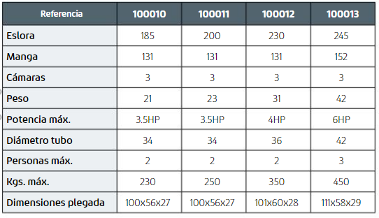 • Fabricadas en PVC con base de tela de poliéster de alta tenacidad 1100 DTCEX de alta calidad específicamente tratado para una óptima resistencia a los rayos UV. • Tablillas de madera. Sencillo desmontaje. • Equipamiento estándar: Banco de asiento, remos, bomba de aire de pie, kit de reparación y bolsa de transporte.